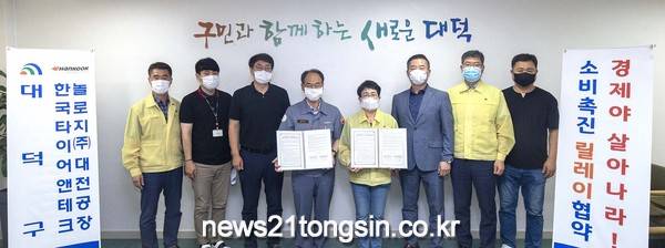 대덕구(박정현 구청장)는 29일 구민의사랑방에서 코로나19로 인한 경기침체 극복을 위해 한국타이어앤테크놀로지(주)대전공장(윤정록 공장장, 이하 ‘한국타이어’)과 ‘경제야 살아나라! 소비촉진 릴레이 협약’을 체결했다.
