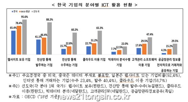 하지만, 기업의 ICT 활용도 측면에서는 OECD 평균 이하인 것으로 나타났다. 한국 기업들은 인터넷을 통한 거래(수주, 발주)와, 고객관리 및 공급망 관리 분야에서 ICT 기술을 이용하는 기업 비율이 OECD 평균보다 낮았다.