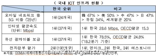 또한 인터넷 평균속도 1위, 광케이블 보급 1위(OECD, ’18년), 전자정부평가 2위(UN, ’20년) 등 ICT인프라 보급 및 접근성에서 손꼽히는 ICT 인프라 강국이다.