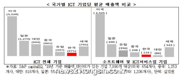 S&P capitalIQ에 데이터가 있는 ICT기업을 분석한 결과, 한국 ICT기업의 기업당 평균 매출액은 2,710억 원으로 세계 평균인 7,950억원의 1/3을 약간 넘고, 세계 1위인 미국기업 평균(3.3조원) 대비 약 1/12 수준인 것으로 나타났다.