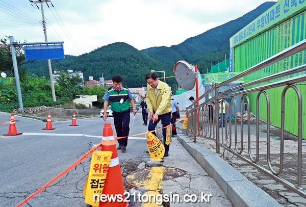 류태호 태백시장이 지난 주말 이틀간 내린 비로 일부 피해를 입은 현장을 오늘(3일) 오전 직접 점검했다.