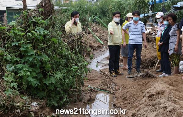 지난달 31일에도 예정된 일정을 취소하고 소정지하차도, 신상동 인공습지 침수현장과 이사동 도로붕괴 현장 등을 점검하고 신속 복구를 당부했다.