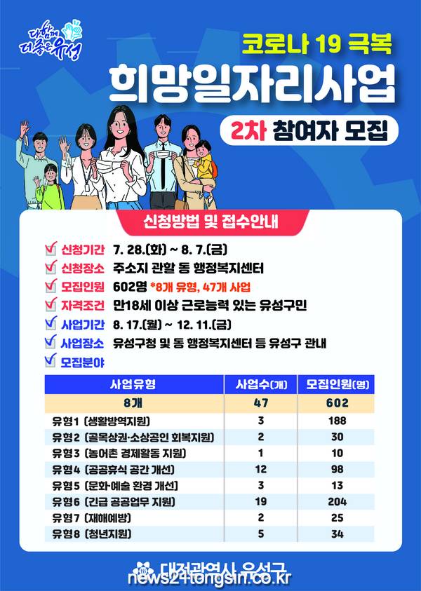 대전 유성구(구청장 정용래)는 코로나19로 인한 고용위기 극복을 위해 희망일자리사업 참여자 602명을 오는 7일까지 추가로 모집한다고 2일 밝혔다.