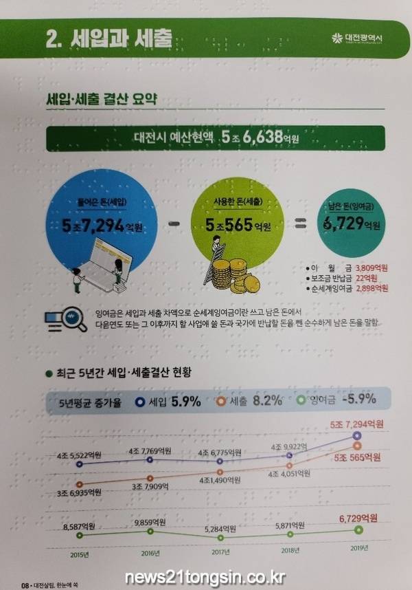 대전시는 2019회계연도 ‘대전 살림, 한눈에 쏙!’ 알기 쉬운 결산서를 점자책과 음성파일로 제작해 시각장애인들과 행정소외계층에게 제공한다고 4일 밝혔다.