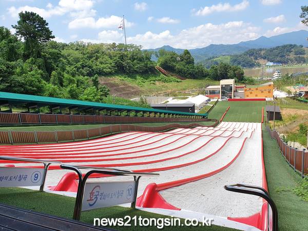또 여름철에는 튜브를 타고 수영장으로 미끄러져 내려오고 겨울에는 수영장 자리에 잔디 착륙장이 설치되어 사시사철 계절에 구애받지 않고 썰매를 즐길 수 있다는 큰 장점을 가지고 있다.