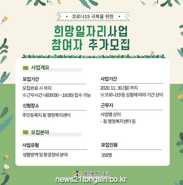 대전 중구(구청장 박용갑)는 코로나19 경제위기 극복을 위한 희망일자리사업 중 생활방역 및 환경정비 분야에 358명을 추가 모집한다.