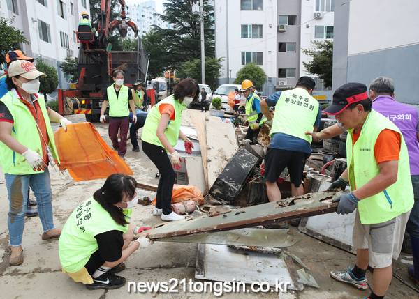 지난달 30일 폭우로 큰 침수 피해를 본 정림동 코스모스아파트가 수재민을 돕기 위해 달려 온 1,640여 명의 자원봉사자(단체)들이 복구 작업에 팔을 걷어붙인 결과 빠르게 복구되고 있다.