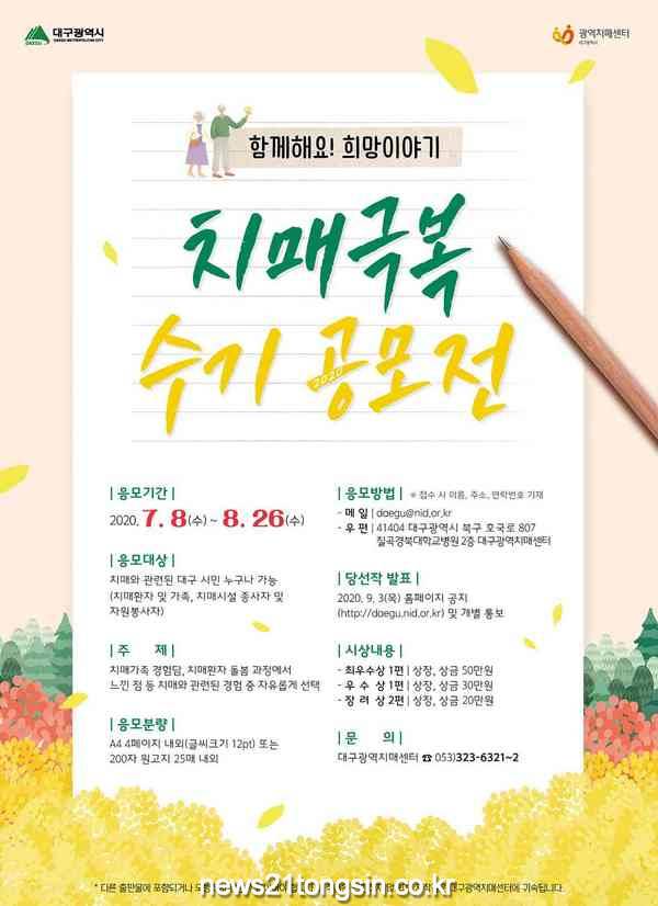 (대구=뉴스21통신) 유재원기자 = 대구시와 대구광역치매센터는 치매극복의 날(9.21)을 맞이해 치매 관리의 중요성을 널리 알리고, 치매 극복을 위한 범국민적 공감대를 형성하기 위해 ‘2020년 치매극복 수기 공모전’을 개최하고 작품을 접수하고 있다.