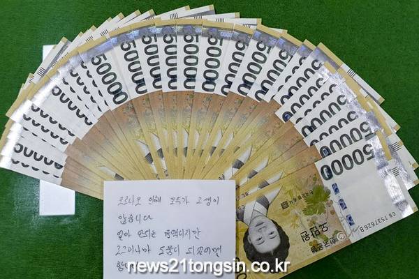 우편 봉투 안에는 5만원 지폐 30장과 함께 ‘코로나로 인해 모두가 고생이 많습니다. 얼마 안 되는 금액이지만 조금이나마 도움이 되었으면 합니다’고 적힌 메모지도 함께 발견됐다.