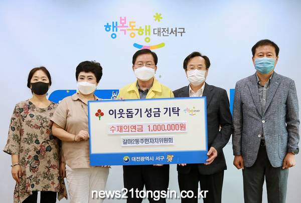 대전 서구(구청장 장종태)는 10일 청사 갑천누리실에서 갈마2동 주민자치위원회(회장 길관호)로부터 수재의연금 100만 원을 기탁받았다.