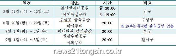 공연은 8월 21일, 22일 남구 앞산빨래터공원 야외특설무대에서, 8월 28일, 29일은 수성못 상화동산 야외무대, 9월 1일, 2일 북구 이태원길 팔거광장, 9월 4일, 5일은 달서구 월광수변공원에서 진행된다.