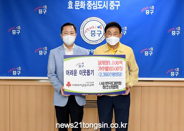 대전 중구(구청장 박용갑)는 11일 청사 구민사랑방에서 사단법인 한국다문화청소년협회(이사장 박옥식)와 수해구호물품 등 기탁식을 가졌다.