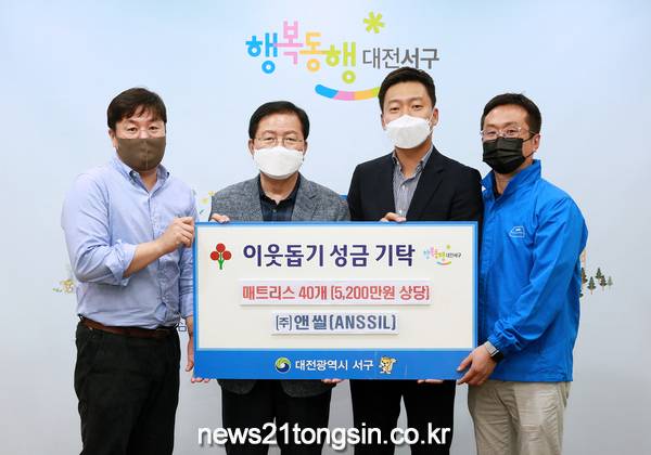 대전 서구(구청장 장종태)는 11일 청사 갑천누리실에서 ㈜앤씰(대표 송범근)로부터 스트링 고급 매트리스 40개(5,200만 원 상당)을 기탁받았다.