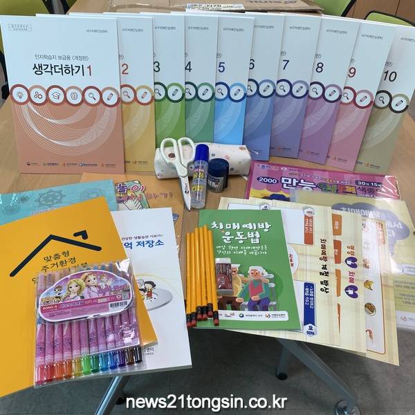 이번에 지원된 인지교구 꾸러미는 치매안심센터 인지강화교실 ‘기억청춘학교’ 대기자 30명에게 인지학습지(생각더하기1~10), 만다라 색칠하기, 치매 예방운동 포스터, 나의 기억일기장 등 가정 내에서 적용할 수 있는 내용으로 구성되어 있다.