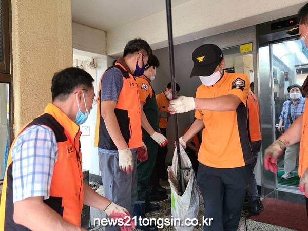 이들은 침수피해 가구를 찾아 소방펌프차 등을 활용해 빗물에 잠겨 흙탕물로 범벅이 된 가재도구를 씻고 집 내부까지 밀려온 토사와 무거운 폐기물을 외부로 옮기는 등 일손을 보탰다.