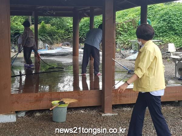 이에 주민들과 공무원들은 마을입구의 토사를 제거하고, 수해쓰레기를 수거하는 등 대청소와 동시에 방역을 하여 마을이 다시 쾌적한 환경을 찾을 수 있도록 한마음으로 협력했다.