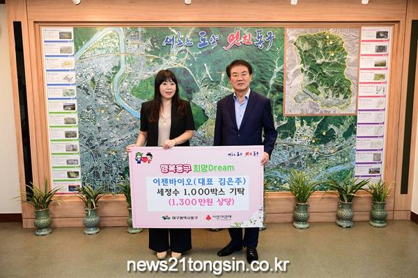 (대구=뉴스21통신) 김병철 기자= 이젠바이오는 지난 12일 어려움을 겪고 있는 동구 내 지역 주민들에게 전달해 달라며, 과일야채 세정수 1,000박스(1,300만원 상당)를 기탁했다.