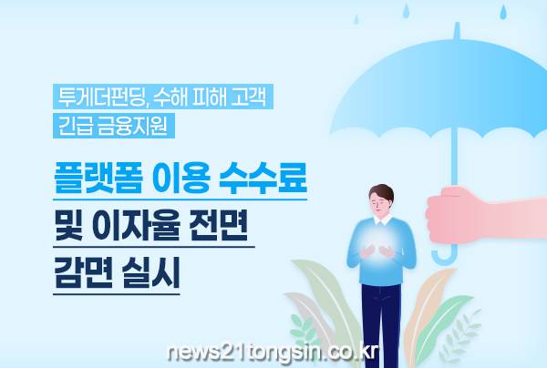투게더펀딩(투게더앱스)이 집중호우로 피해를 본 고객 지원에 나선다. 투게더펀딩은 수재민 고객을 대상으로 수수료 감면과 이자율 감면 등 지원대책을 마련해 시행키로 했다고 14일 밝혔다.
