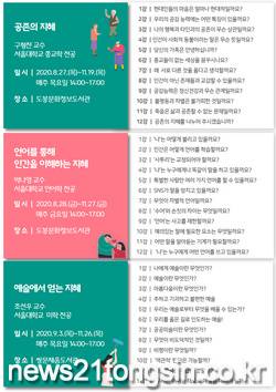 도봉문화정보도서관에서는 ▲8월 27일부터 11월 19일까지 인류가 지닌 공존의 능력을 이해하고 다양한 사람들과 겪는 문제를 해결하기 위해 고민하는 ‘공존의 지혜’(구형찬 교수, 서울대학교)와 ▲8월 28일부터 11월27일까지 내가 쓰는 언어를 이해함으로써 타인을 이해하는 법을 배우는 ‘언어를 통해 인간을 이해하는 지혜’(박나영 교수, 서울대학교)를 강의한다.