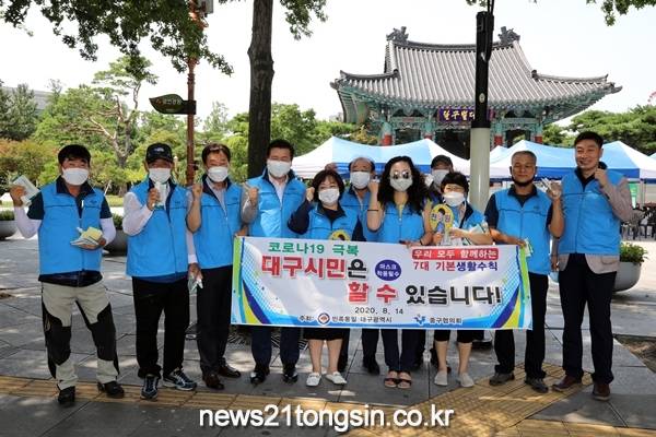 (대구=뉴스21통신) 김병철 기자= 민족통일 중구협의회는 지난 14일 종각네거리 인근에서 ‘코로나19 생활속 거리두기 캠페인’을 전개했다.