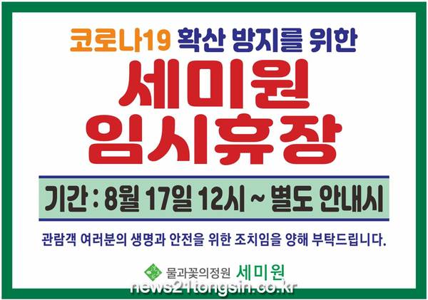 최근 수도권을 중심으로 확산세가 이어지자 지난 8월 15일 서울‧경기 사회적 거리두기 단계가 2단계로 격상되었다. 이를 바탕으로 불특정 다수 관람객이 입장하는 공공다중시설 세미원은 코로나19 확산을 방지하고 관람객과 지역사회의 안전을 확보하고자 고심 끝에 휴장을 결정했다. 범국가적인 확산방지대책이 이어짐에 따라 정부 정책에 협조하여 ‘사회적 거리두기’에 동참하자는 취지이다.