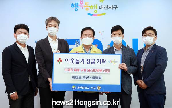 대전 서구(구청장 장종태)는 20일 청사 갑천누리실에서 이마트 둔산점(지점장 박용필) 및 이마트 트레이더스 월평점(지점장 배웅렬)으로부터 전자레인지 33대 및 이불 60채 등 총 300만 원 상당의 후원 물품을 기탁받았다.