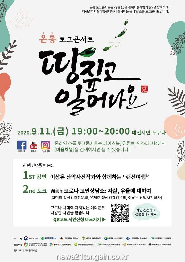 대전시와 대전광역자살에방센터는 2020년 세계자살예방의 날 기념 ‘온통 토크콘서트’를 9월 11일 금요일 오후 7시부터 온라인으로 진행한다고 24일 밝혔다.