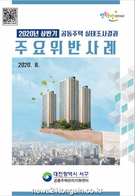대전 서구(구청장 장종태)는 공동주택관리의 투명성 제고와 효율화를 위해 관내 공동주택에 대한 실태조사를 하고 주요 위반사례를 모아 사례집을 발간했다고 23일 밝혔다.