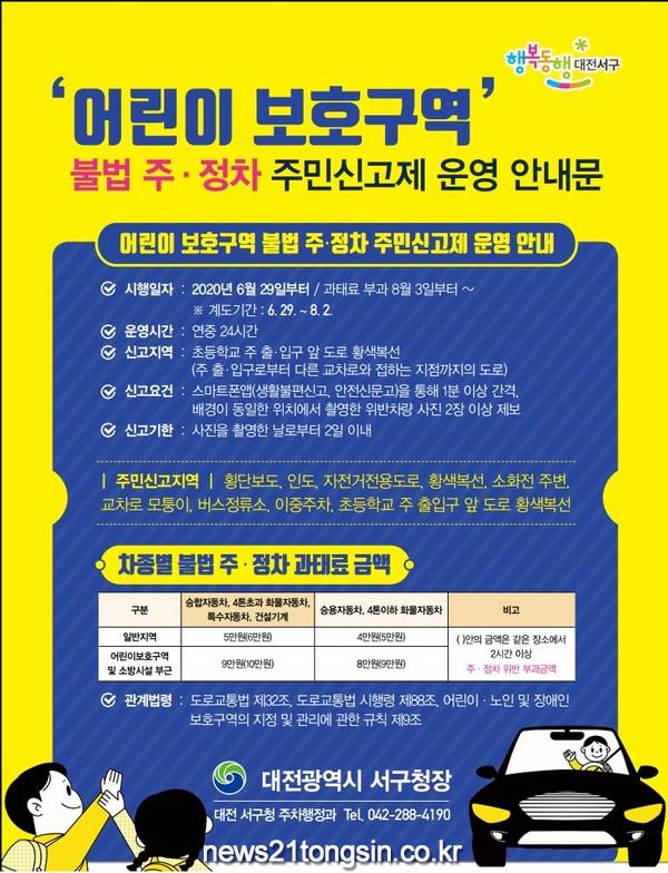 대전 서구(구청장 장종태)는 지난 3일부터 시행된 어린이보호구역 내 불법 주ㆍ정차 주민신고제 조기 정착을 위해 관내 40개 초등학교 어린이보호구역 현장점검을 실시했다고 24일 밝혔다.