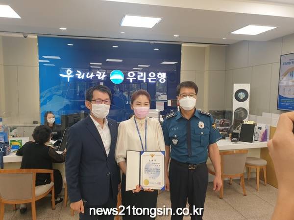 이동기 대전둔산경찰서장은 8. 25.(화) 10:00 보이스피싱 현금수거책을 신고해 피해를 예방한 우리은행 대전금융센터 이윤정 과장에게 감사장을 수여했다.