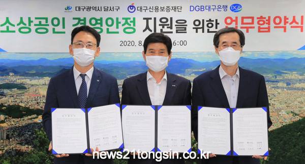 (대구=뉴스21통신) 박창남 기자 = 달서구는 8월 25일 구청 5층 회의실에서 소상공인 경영안정자금 지원을 위한 특례보증 및 이차보전을 위해 3자(달서구 – 대구신용보증재단 - 대구은행) 업무협약을 체결했다.