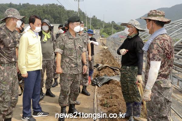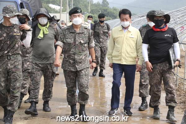 이날 현장에 도착한 서욱 참모총장은 마스크를 쓰고 연신 굵은 땀방울을 흘리며 피해 복구에 여념이 없는 장병들을 만나 격려의 말을 전했다.