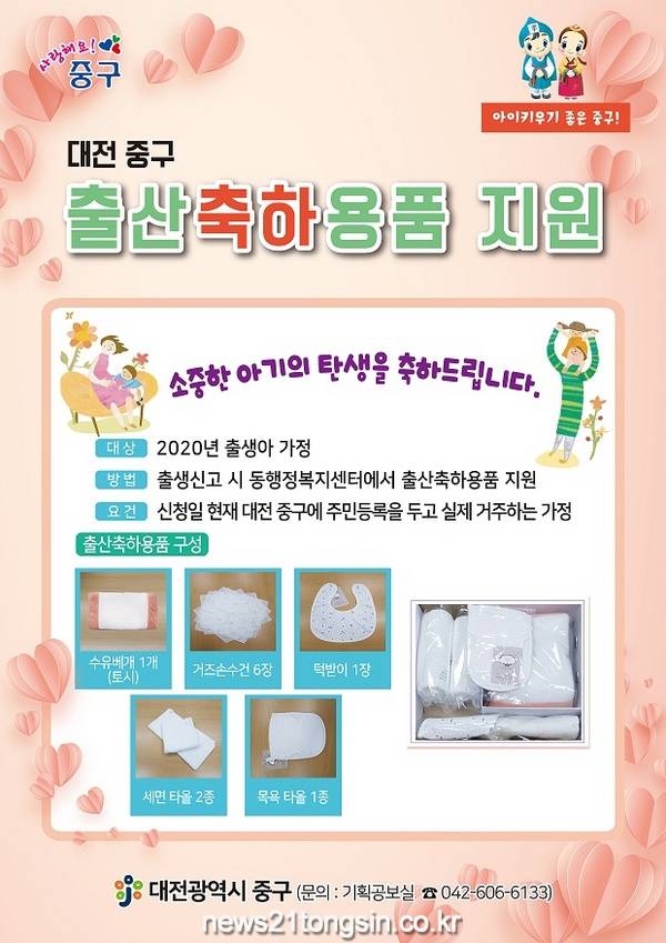 대전 중구(구청장 박용갑)는 2020년 1월 출생아부터 육아용품 5종을 지원하는 2020년 출산축하용품 지원 사업을 추진한다.