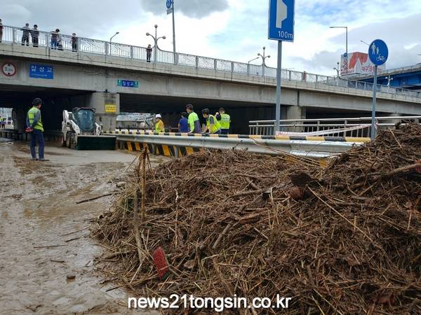 이에 공단 도로관리처는 100여명의 인력과 스키드로더, 살수차, 덤프트럭 등을 동원해 하천 부유물과 진흙을 신속히 제거해 7일 19시경 신천동로의 통행을 재개했다.