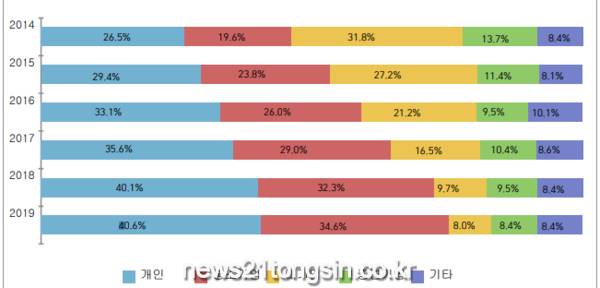 경제주체별 출원 동향을 보면 개인은 ‘14년 26.5%에서 ‘19년 40.6%로, 중소기업은 ‘14년 19.6%에서 ‘19년 34.6%로 증가하는 등 개인 및 중소기업의 출원비중은 ‘14년 46.1%에서 ‘19년 75.2%로 크게 증가한 반면, 대기업 비중은 ’14년 31.8%에서 ‘19년 8.0%로 크게 감소하였다. [붙임 3]