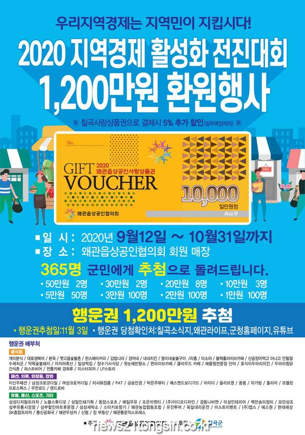 왜관읍상공인협의회 소속 1백여 개의 매장에서 9월 12일부터 10월 31일까지 일정금액 이상 구매 시에는 행운권을 지급하고 칠곡사랑상품권으로 결재 시에는 최대 5%를 추가로 할인 한다.
