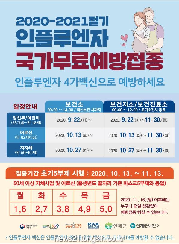 인제군보건소는 오는 22일부터 2020-2021절기 독감 인플루엔자 예방접종을 실시한다.