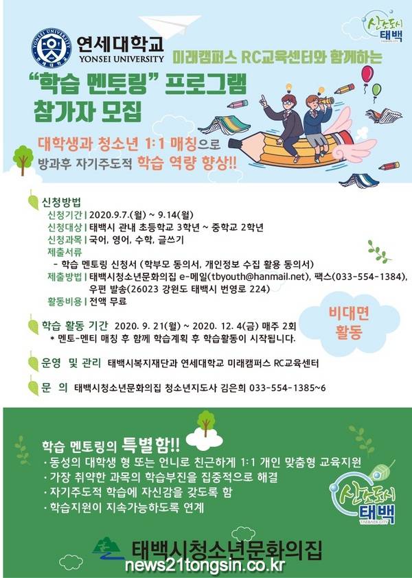 태백시는 오는 21일(월)부터 12월 4일(금)까지 태백시청소년문화의집(관장 김석민)에서 관내 청소년 50명을 대상으로 온라인(비대면)을 통한 개인 맞춤형 1:1 학습 멘토링 프로그램을 진행한다고 밝혔다.
