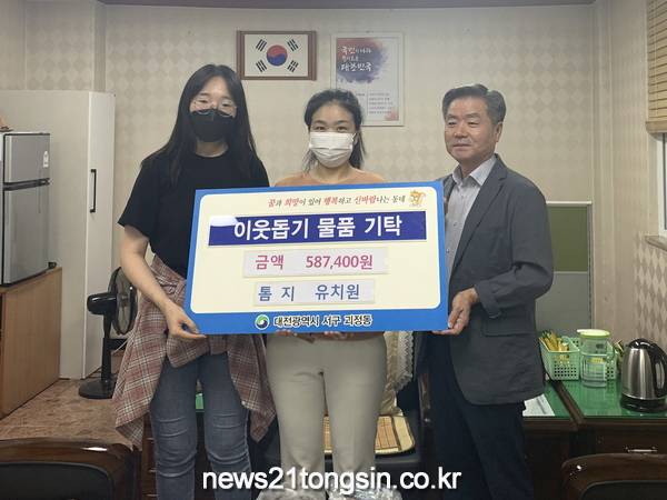 대전 서구(구청장 장종태) 괴정동 행정복지센터(동장 임인식)는 톰지 유치원(원장 김효순)으로부터 원아들이 모금한 성금 587,400원을 기탁받았다고 14일 밝혔다.