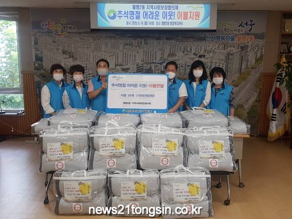 대전 서구(구청장 장종태) 월평2동 지역사회보장협의체(위원장 최우석)는 고유 명절인 추석을 맞아 어려운 이웃에게 100만 원 상당의 간절기 이불 20채를 전달했다고 15일 밝혔다.