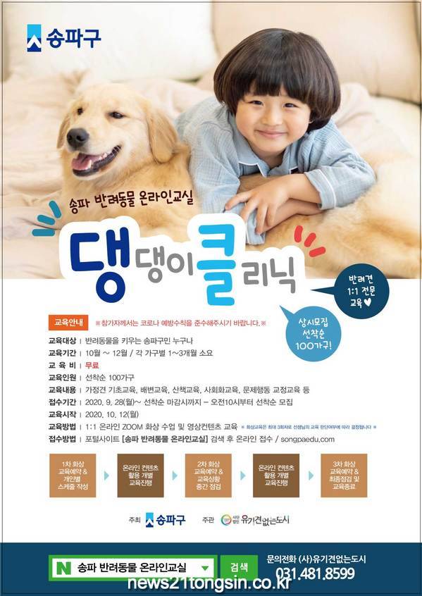반려동물을 키우는 송파구민이면 누구나 신청가능하다. ‘송파 반려동물 온라인교실’ 홈페이지에서 9월 28일부터 선착순 100명을 모집한다.