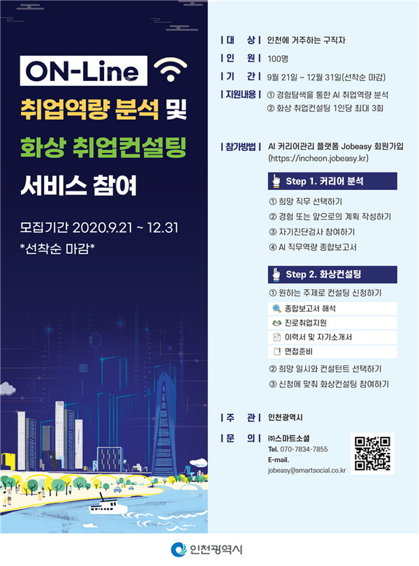 인천광역시(시장 박남춘)는 코로나19 장기화로 인해 취업지원센터를 직접 방문하는 등의 대면 취업 활동이 어려워진 구직자들을 지원하기 위해 PC 또는 스마트폰을 활용하여 손쉽게 취업 준비를 할 수 있도록 ‘온라인 취업역량 분석 및 화상 취업컨설팅’ 서비스를 연말까지 운영할 계획이다.