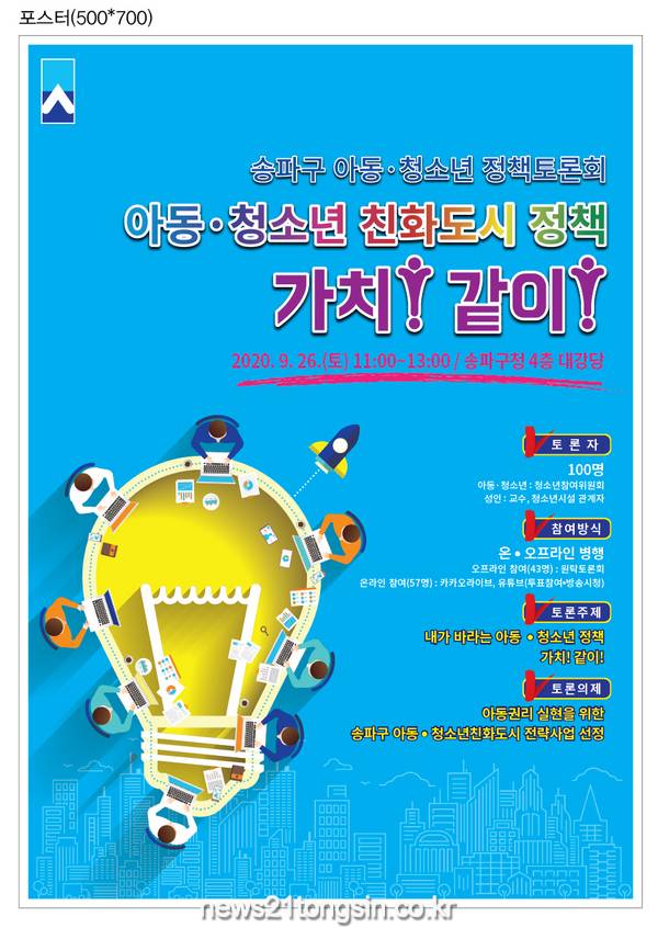 송파구(구청장 박성수)가 오는 26일(토) 오전 11시 송파구청 4층 대강당에서 100여 명 구민이 참여하는 온·오프라인 「아동·청소년 정책토론회」를 개최한다.