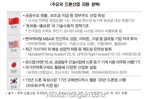 주요국은 한발 앞서 강력한 산업육성책을 실시했고 제도 유연화를 추진했다. 중국은 ‘先허용-後보완’의 기술수용적 정책기조와 함께, 강력한 공공수요 창출과 보조금 지급 등 정부주도로 산업을 빠르게 육성하였다. DJI, 이항 등 기업의 성공으로 세계 최대 소형드론 생산기지로 자리 잡을 수 있었다. 최근에는 R&D 투자에도 집중해 기술력을 확보하는 선순환 구조를 갖추었다는 평가를 받고 있다.