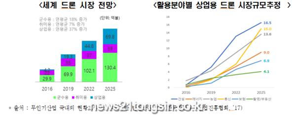 드론은 군사, 취미 외에도 안전진단, 감시 측량, 수송, 물품 배송, 운송수단 등 다양한 활용이 가능해 시장 자체가 비약적으로 성장하는데다 연관 산업에 파급력이 커, 2016년 56.1억 달러인 드론시장 규모는 2025년 239억 달러로 증가할 것으로 전망된다. 군수용 시장이 꾸준히 증가하는 가운데 취미용보다 상업용의 성장이 빨라, ’22년이면 취미용(37억불)보다 상업용 시장규모(44.8억불)가 앞설 것으로 예상된다. 건설과 통신, 농업 분야 등이 성장이 밝을 것으로 기대되는 분야이다.
