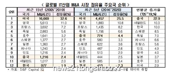 지난 15년간 이루어진 전 세계 IT산업 M&A 시장 점유율(인수기업 기준)을 분석한 결과, 글로벌 IT M&A의 3분의 1을 미국이 차지하며 점유율 1위를 기록했다. 중국은 연평균 증가율 1위(22.9%)로 공격적인 M&A 전략을 펼치는 행보를 보였다.
