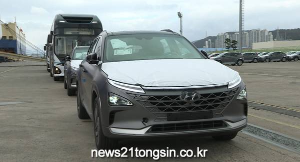 현대자동차는 27일(일) 울산항에서 수소전기차 ‘넥쏘’ 2대, 수소전기버스 ‘일렉시티 FCEV’ 2대 등 총 4대를 선적해 사우디 아라비아로 수출했다고 밝혔다.