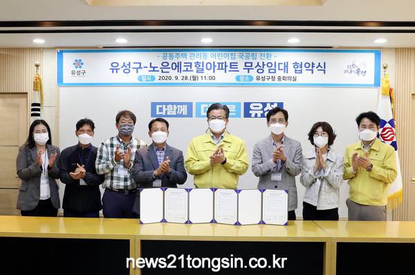 대전 유성구(구청장 정용래)는 28일 구청 중회의실에서 노은에코힐아파트 입주자대표회의(회장 주인수), 한국토지주택공사(대전북부권종합주거복지 지사장 김용귀)와 공동주택 내 의무어린이집의 국공립어린이집 전환을 위한 협약을 체결했다고 밝혔다.
