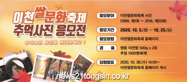 축제의 추억을 되살리고 내년 축제의 성공을 기원하기 위해 준비된 ‘이천쌀문화축제 추억사진 응모전’은 사진의 형식과 내용은 제한이 없으며 1인 1매 참가가 가능하다. 10월5일부터 10월25일까지 지역과 나이에 관계없이 축제 홈페이지에서 응모 할 수 있다. 제1회부터 제20회까지 축제와 관련된 사진을 응모하면, 추첨을 통해 이천 햅쌀 500g 2포를 받아 볼 수 있다. 모두 천명 대상 경품 행사로, 개인별로 택배 발송 예정이다.