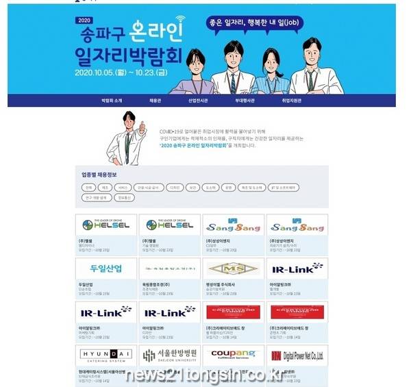 송파구(구청장 박성수)가 코로나19로 구직에 어려움을 겪는 구민들을 위해 10월 5일부터 23일까지 ‘2020 송파구 온라인 일자리박람회’를 개최한다.